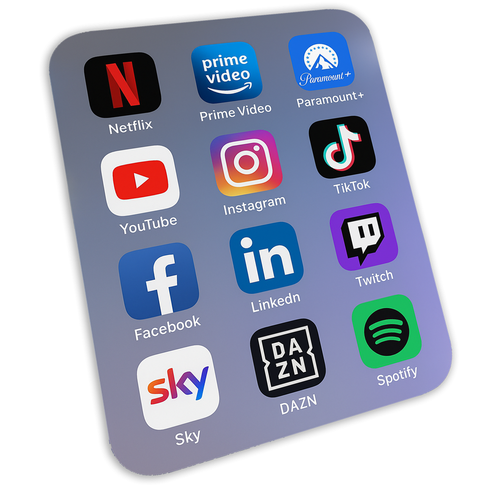 Werbeplatzvermarktung auf Netflix, Sky, DAZN, Amazon, Twitch, Instagram, TikTok, Paramount +, RTL+ und YouTube sowie klassische Außenwerbung.